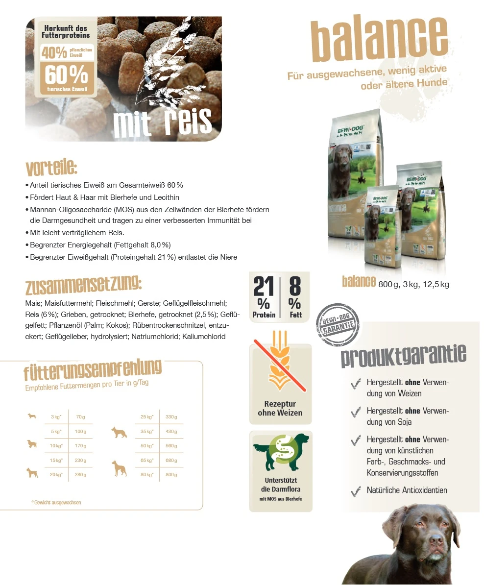 Ihr Hund bewegt sich wenig, ist schon älter oder hat ein bisschen viel Gewicht auf den Rippen? Dann empfiehlt sich das energiereduzierte BEWI DOG® balance mit leicht verträglichem Reis und geringem Fettgehalt.